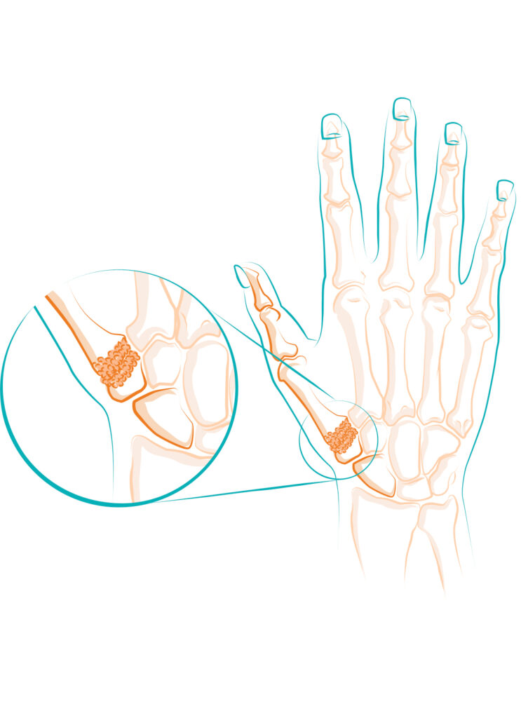 Die Rhizarthrose betrifft das Trapezium-Metakarpal-Gelenk an Daumenwurzel.